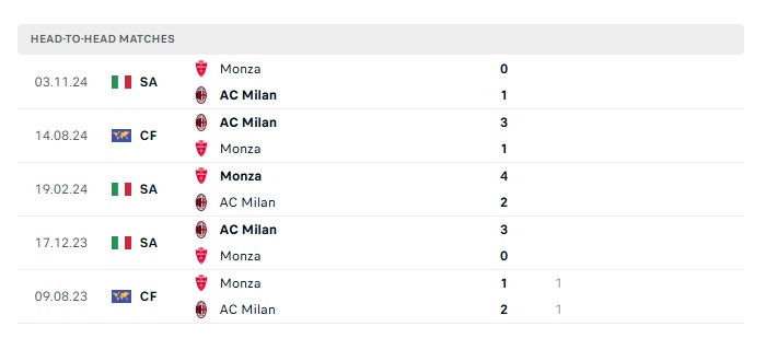 • Kèo tỷ số H2 AC Milan vs Monza: 0-0