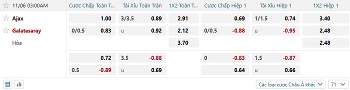 Bảng tỷ lệ kèo bóng đá hôm nay Ajax vs Galatasaray