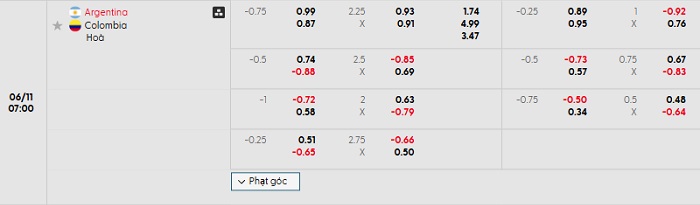 Bảng tỷ lệ kèo nhà cái Argentina vs Colombia