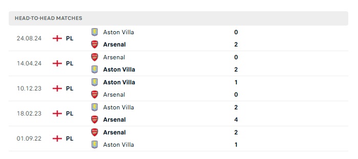 Lịch sử đối đầu Arsenal vs Aston Villa