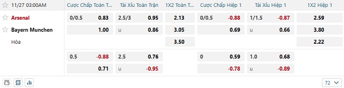• Kèo tỷ số H1 Arsenal vs Bayern Munich: 0-0
