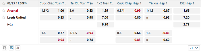 - Kèo tỷ số H1 Arsenal vs Leeds Utd: 2-0