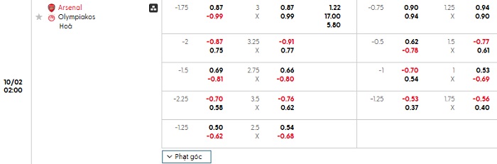 Bảng tỷ lệ kèo nhà cái Arsenal vs Olympiakos