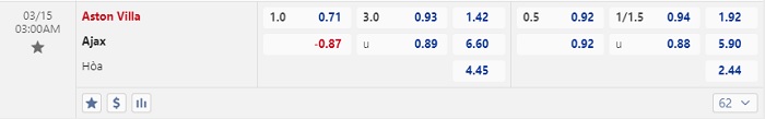 Bảng tỷ lệ kèo bóng đá Aston Villa vs Ajax