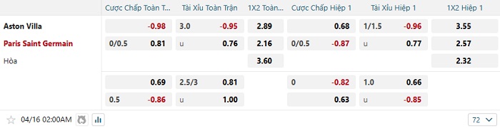 Bảng tỷ lệ kèo nhà cái Aston Villa vs PSG