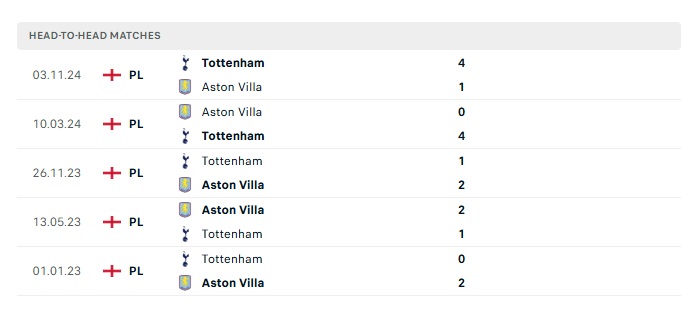 Lịch sử đối đầu Aston Villa vs Tottenham