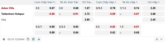 Bảng tỷ lệ kèo bóng đá Aston Villa vs Tottenham