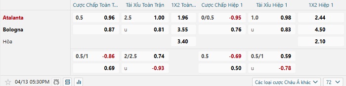 Bảng tỷ lệ kèo nhà cái Atalanta vs Bologna