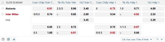 Bảng tỷ lệ kèo bóng đá hôm nay Atalanta vs Inter Milan