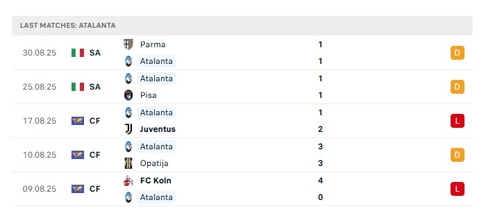 Phong độ gần đây Atalanta vs Lecce