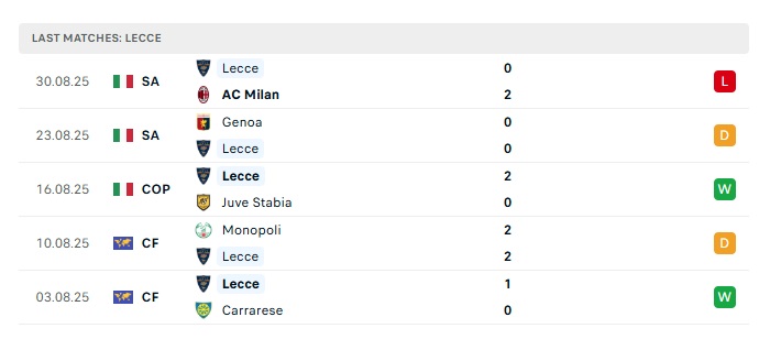 - Phong độ gần đây Lecce