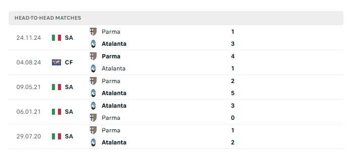 Lịch sử đối đầu Atalanta vs Parma