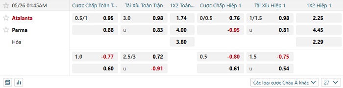 Bảng tỷ lệ kèo nhà cái Atalanta vs Parma