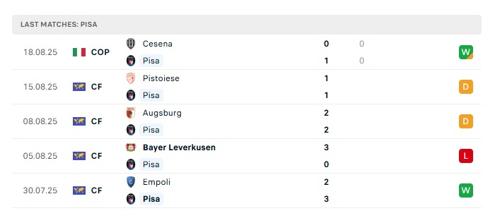Tuy vượt trội về sức mạnh nhưng phong độ của Atalanta trong thời gian qua không hề tốt. Cụ thể thì trong 5 trận gần nhất của Atalanta, họ chỉ thắng 2, hòa 1 và thua 2 trận còn lại. Trong khi đó thì Pisa nhỉnh hơn đôi chút với 2 thắng, 2 hòa và 1 thua trong 5 lần ra sân gần nhất. Dù vậy, đối thủ mà Pisa đối đầu, không có cái tên nào ngang bằng với các đối thủ của Atalanta nên đội chủ nhà rất tự tin dễ dàng thắng trận.