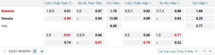Hiện tại, nhà cái đang niêm yết cho Atalanta mức chấp -1 3/4 và họ có thừa khả năng thắng áp đảo đối thủ. Nên biết rằng trong 5 trận đấu gần nhất của Venezia, họ chỉ có đúng 1 trận thắng kèo, thua 4. Song song đó, Atalanta trong 4 trận đấu liên tiếp vừa qua, họ cũng đã toàn thắng kèo cả 4. Do đó, các chuyên gia đều tin rằng kèo châu Á trận đấu hôm nay sẽ khép lại với đội chủ nhà là lựa chọn tốt nhất trong cả 2 hiệp.