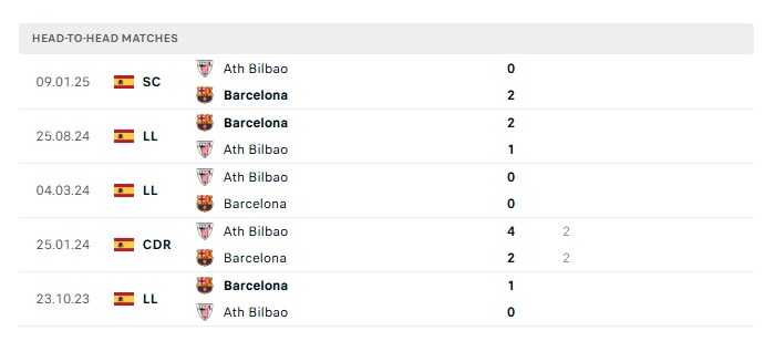 Lịch sử đối đầu Athletic Bilbao vs Barcelona