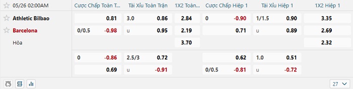 Bảng kèo bóng đá Athletic Bilbao vs Barcelona