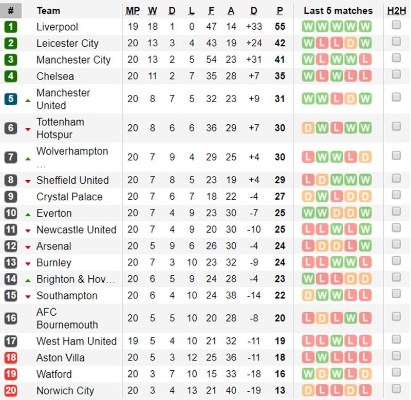 Danh sách 20 đội tuyển tham dự giải ngoại hạng Anh (EPL) sẽ được cập nhật vị trí bảng xếp hạng ngoại hạng Anh vào mỗi tuần.