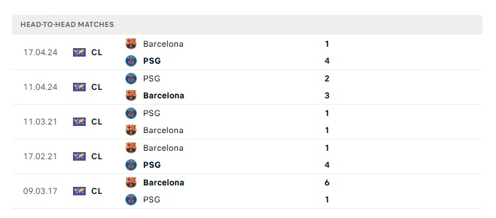 Phong độ gần đây Barcelona vs PSG