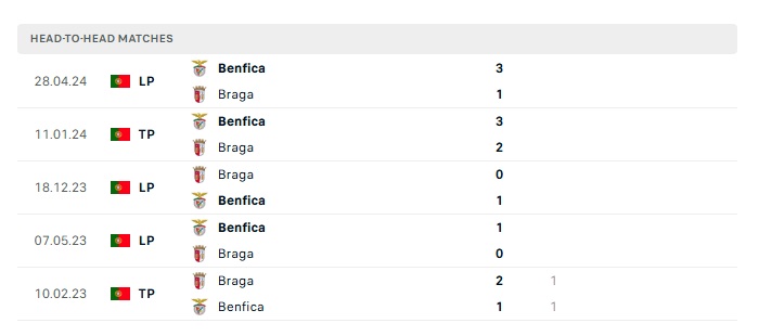 Lịch sử đối đầu Benfica vs Braga