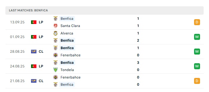 • Phong độ gần đây Benfica