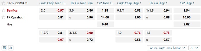 Bảng tỷ lệ kèo bóng đá Benfica vs Karabakh Agdam
