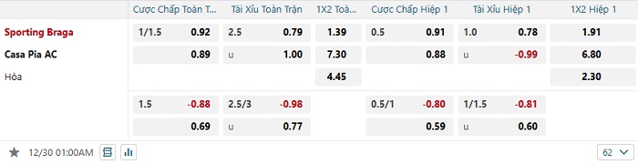 Bảng tỷ lệ kèo bóng đá Braga vs Casa Pia AC