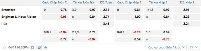 Bảng tỷ lệ kèo bóng đá Brentford vs Brighton