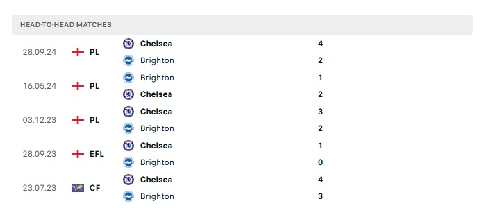 Phong độ gần đây Brighton vs Chelsea