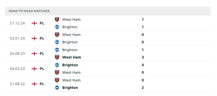Lịch sử đối đầu Brighton vs West Ham Utd