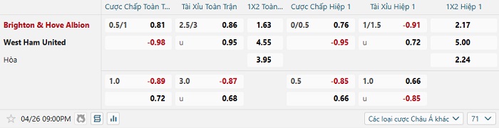 Soi kèo châu Á, kèo Brighton vs West Ham Utd