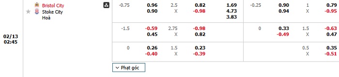 Bảng tỷ lệ kèo bóng đá Bristol City vs Stoke City