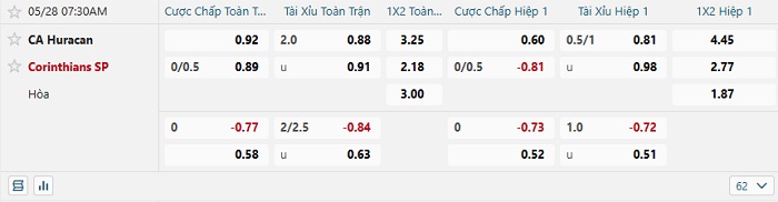 Bảng tỷ lệ kèo bóng đá hôm nay CA Huracan vs Corinthians