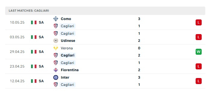 - Phong độ gần đây Cagliari