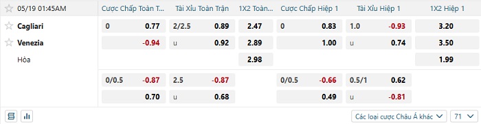 Bảng kèo bóng đá Cagliari vs Venezia