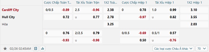 Bảng tỷ lệ kèo bóng đá Cardiff City vs Hull City