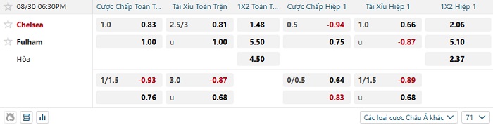 - Kèo tỷ số H1 Chelsea vs Fulham: 1-0