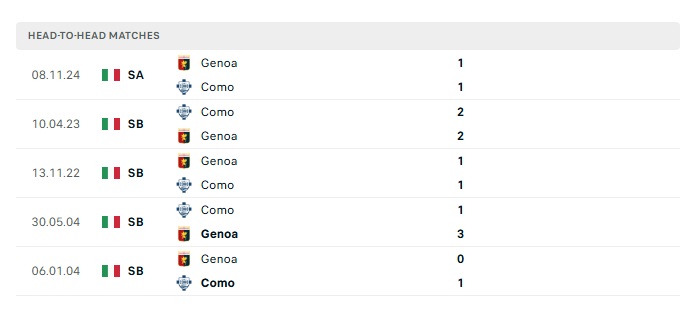 - Kèo tỷ số H2 Como vs Genoa: 1-0