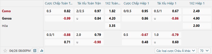 - Kèo tỷ số H1 Como vs Genoa: 0-0