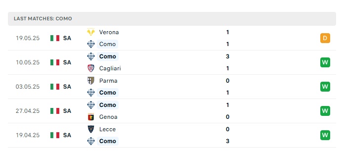 Phong độ gần đây Como vs Inter Milan