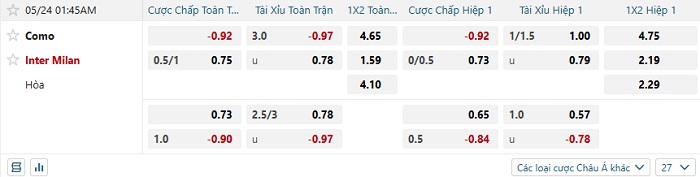 - Kèo tỷ số H1 Como vs Inter Milan: 0-1