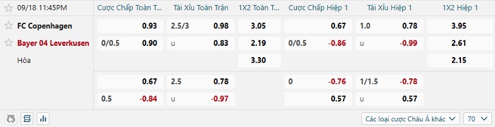 Bảng tỷ lệ kèo bóng đá Copenhagen vs Bayer Leverkusen