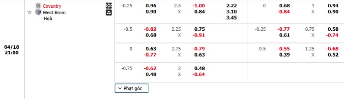 Bảng tỷ lệ kèo bóng đá hôm nay Coventry vs West Brom