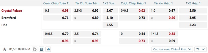 Bảng tỷ lệ kèo bóng đá Crystal Palace vs Brentford