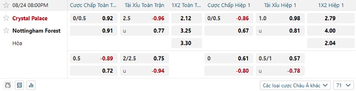 Bảng tỷ lệ kèo bóng đá Crystal Palace vs Nottingham Forest