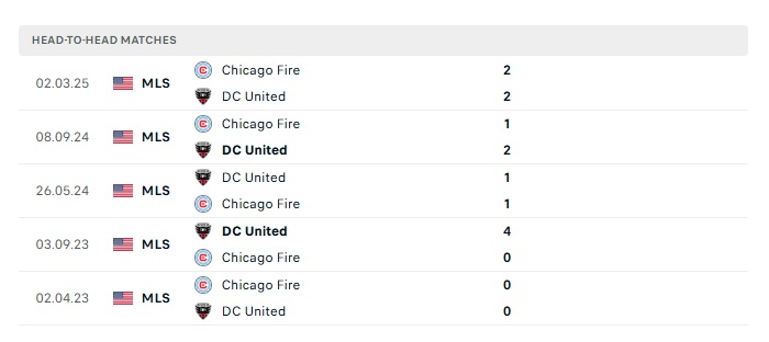 Lịch sử đối đầu D.C. Utd vs Chicago Fire