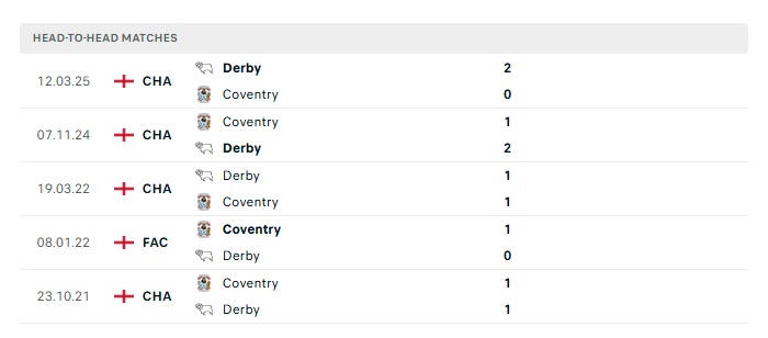 • Kèo tỷ số H2 Derby County vs Coventry: 0-0