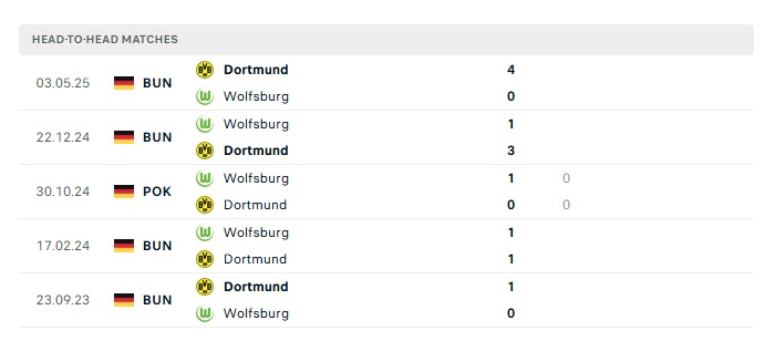 Lịch sử đối đầu Dortmund vs Wolfsburg