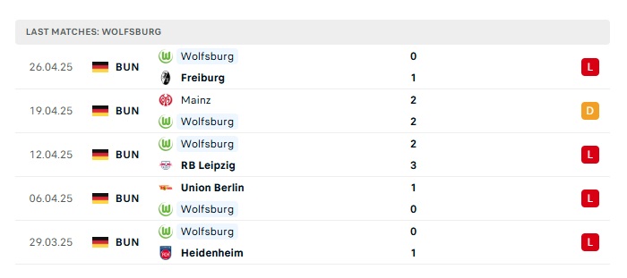 • Phong độ gần đây Wolfsburg