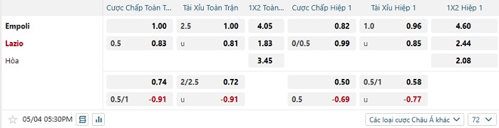 Bảng tỷ lệ kèo bóng đá hôm nay Empoli vs Lazio